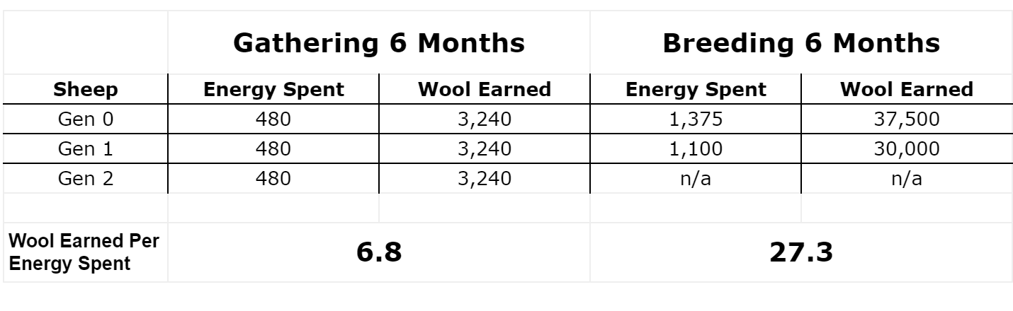 - If you have 2 Gen0 sheep, you can gather with them for 6 months and earn 6,400 wool, or breed with them for 6 months and produce around 75,000 wool (assuming you burned the Gen2’s immediately without collecting first.