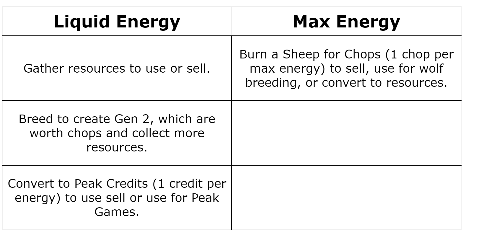 https://shepslibrary.com/sheep#energyThere are two types of energy - max energy and liquid energy. Each animal has a max energy level that they can recharge to, for Gen0 sheep the max energy is 1,000. The liquid energy increases and decreases depending on your in-game action.