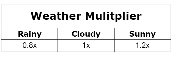 Weather also effects your ability to maximize profits. Claiming on Sunny day will multiplier your resources another 1.2x on top of the daily gathering multiplier.